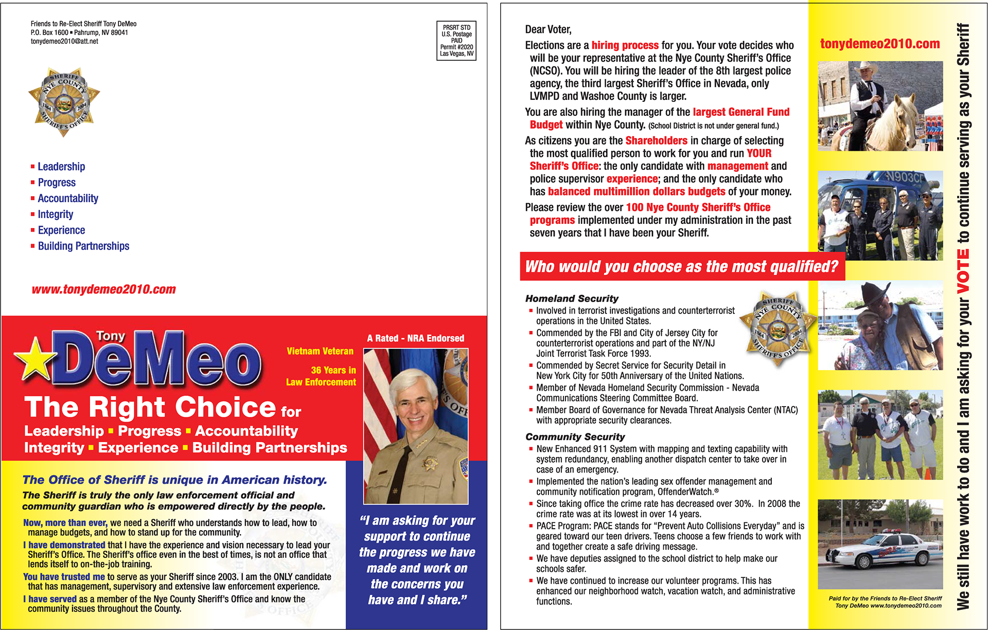 This mail piece lists the accomplishments and qualifications of this incumbent for the Sheriff.